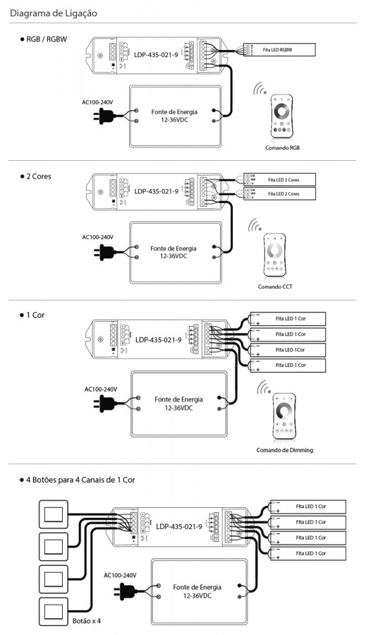 Para iluminação RGB, RGBW e CCT, integra 10 modos dinâmicos.