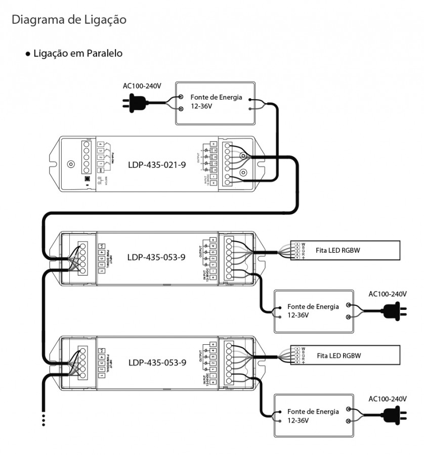 Aplicável em controladores de tensão constante de cor única, duas cores, RGB e RGBW.