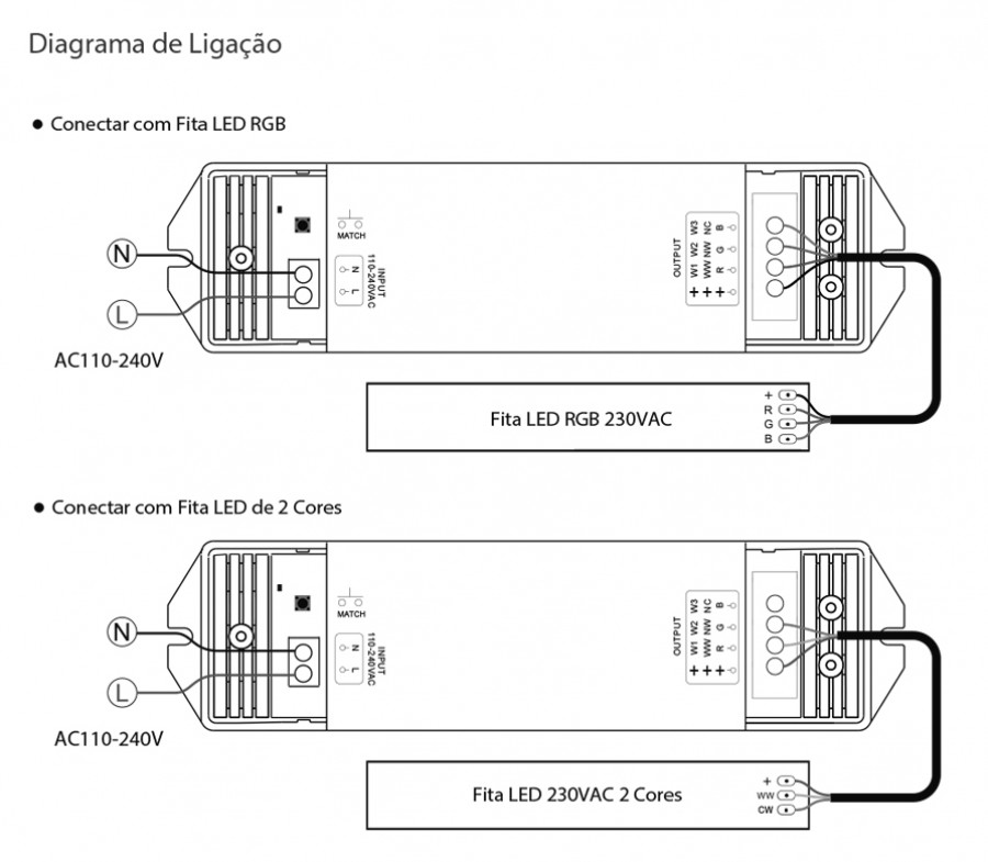 Compatível com comando RF 2.4GHz de cor única, duas cores e RGB.