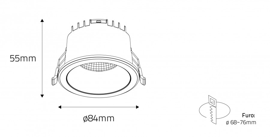 Downlight de alto desempenho, com corpo em plástico anti-uv resistente ao calor, que o torna elegante e moderno.